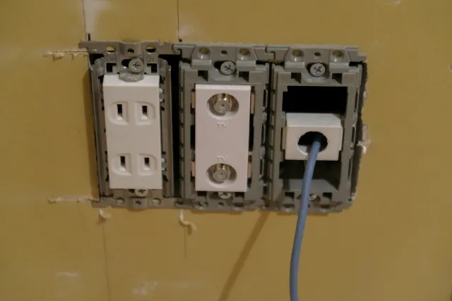 ベースプレートの後ろには、コンセント本体が固定されています。電気を通すための差込口がついたもので、裏側にはケーブルがでています。接続されている端子とケーブルの数は、コンセントによって異なります。